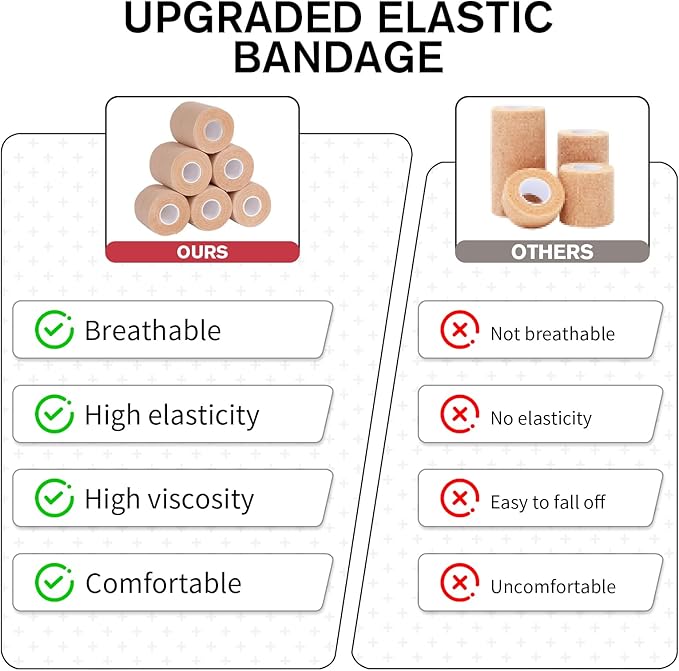 - Proper Adhesion: Our elastic wrap is made with a mild rubber-based adhesive that is sticky enough not to come off with strenuous exercise and stays nice and comfortable enough to put on and take off during sports or recuperating from injuries