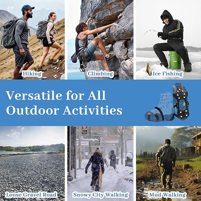 - Winter safety protection in all scenarios: The snow spikes for boots are designed for winter activities such as hiking, commuting, running, fishing, outdoor work, etc. The silicone of the crampons for shoe ice & snow grips remains flexible at low temperatures of -30℃, and the steel nails do not crack when penetrating the ice layer, protecting the safety of walking and sports on ice and snow roads in all directions